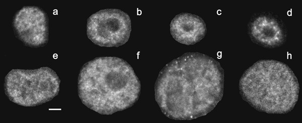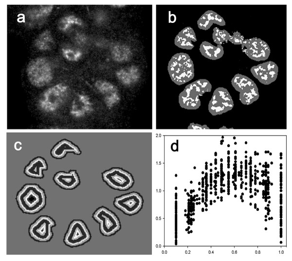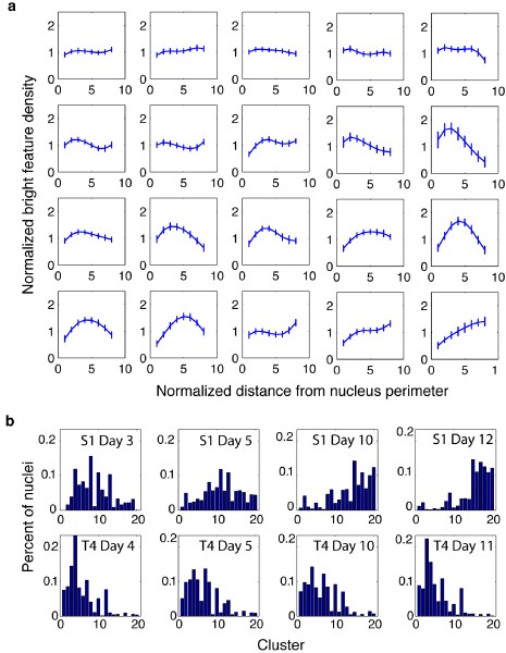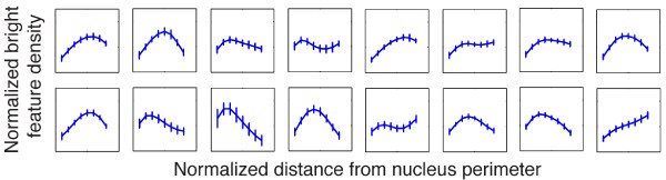 本环节旨在量化每个细胞核内核有丝分裂装置蛋白的径向分布特征,将图像的定性信息转化为可分析的定量数据。实验采用此前开发的图像分析方法,首先对DAPI通道的图像进行自动细胞核分割,确定每个细胞核的边界;随后在核有丝分裂装置蛋白通道的图像中,计算每个像素点的亮度与周围区域平均亮度的比值,提取出局部亮特征(LBF);通过距离变换算法将每个细胞核划分为等厚度的同心层,计算每层中LBF的密度(亮像素数与总像素数的比值);为消除细胞核大小与形状的影响,对LBF密度和从核边界到中心的距离进行归一化处理,最终得到每个细胞核的LBF径向分布曲线,即归一化LBF密度随归一化距离(0到1)的变化。实验成功提取了所有细胞的LBF分布数据,S1细胞的LBF分布曲线峰值随培养天数增加逐渐向核中心移动,反映核有丝分裂装置蛋白的聚集过程;而T4-2细胞的LBF分布曲线峰值始终位于核周边区域,与核有丝分裂装置蛋白的弥散分布一致,验证了LBF分析技术对核蛋白分布特征的量化能力。文献未提及具体图像分析软件,领域常规使用ImageJ、Fiji等开源图像分析工具。