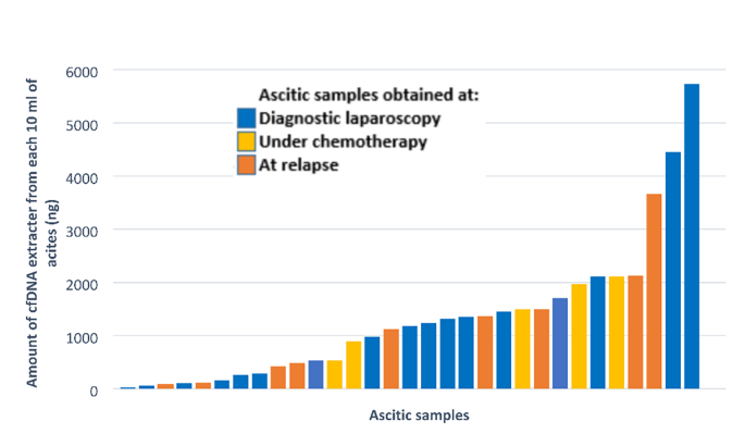 实验目的是提取腹水中的cfDNA,并确认其为肿瘤来源,排除正常细胞cfDNA的干扰。方法细节为从双离心后的腹水中提取cfDNA,采用靶向二代测序(NGS)检测TP53基因突变,分析突变的等位基因频率以判断cfDNA的肿瘤源性。结果解读显示,93%(27/29)的样本可检测到cfDNA,中位含量为1120ng(范围24-5732ng),即使化疗期间采集的样本也可检测到cfDNA;27份可检测cfDNA的样本中100%检测到有害突变,中位等位基因频率为60%(范围3.3-87%),其中92%(25/27)的样本检测到TP53突变,充分证明腹水中的cfDNA为肿瘤源性。