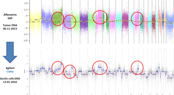 Biomarker定位:本研究中的Biomarker为卵巢癌患者腹水中的肿瘤源性游离DNA(cfDNA),筛选与验证逻辑为:前瞻性采集卵巢癌患者腹水样本→提取cfDNA→靶向NGS检测TP53突变确认肿瘤源性→SNP阵列分析SCNA计算GIS→对比组织样本验证基因组特征一致性,形成完整的筛选与验证链条。研究过程详述:该Biomarker来源于卵巢癌患者的新鲜腹水样本(经双离心处理以去除细胞成分),验证方法包括靶向NGS检测TP53突变(确认肿瘤源性)、SNP阵列分析SCNA计算GIS(评估HRD状态);特异性方面,27份可检测cfDNA的样本中100%检测到有害突变,中位等位基因频率为60%(n=27,P值未明确提供),TP53突变检出率为92%(n=27),充分证明腹水中cfDNA的肿瘤特异性;敏感性方面,93%的腹水样本可检测到cfDNA,即使化疗期间采集的样本也可成功检出,说明该Biomarker的检测敏感性较高;ROC曲线、特异性与敏感性的具体统计数据未在文献中提及。核心成果提炼:腹水中的肿瘤源性cfDNA可作为HRD和BRCA检测的有效替代Biomarker,其GIS评分与组织样本高度一致,4例已知BRCA突变的患者腹水中GIS均为高(n=4,P值未明确提供);创新性在于首次系统证明腹水中cfDNA用于卵巢癌HRD和BRCA检测的可行性,为无法获取组织样本的卵巢癌患者提供了无创、高效的检测途径;统计学结果显示,研究共纳入20例患者(29份腹水样本),17例完成SCNA分析的患者中,64.7%(11/17)为高GIS(HRD阳性),35.3%(6/17)为低GIS(HRD阴性),样本量及分组比例明确。