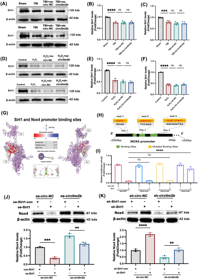 该环节的实验目的是明确Sirt1对Nox4启动子的结合位点,解析circItm2b通过Sirt1调控Nox4表达的分子机制。实验方法为首先通过生物信息学软件预测Nox4启动子区域的Sirt1结合位点,构建野生型(Nox4-WT)和三个突变型(Nox4-mut1、Nox4-mut2、Nox4-mut3)的Nox4启动子荧光素酶报告载体;然后将这些载体分别与Sirt1过表达载体或空载体共转染293T细胞,24小时后检测荧光素酶活性。原文献中该部分的Fig.6I结果描述及图表存在错误,经勘误后修正为:Nox4-WT与Sirt1共转染组的荧光素酶活性显著低于Nox4-mut3与Sirt1共转染组,而Nox4-mut1、Nox4-mut2与Sirt1共转染组的荧光素酶活性与Nox4-WT组无统计学差异(n=3,Nox4-WT + Sirt1 vs Nox4-mut3 + Sirt1,P<0.0001),表明Site 3是Sirt1与Nox4启动子的特异性结合位点。