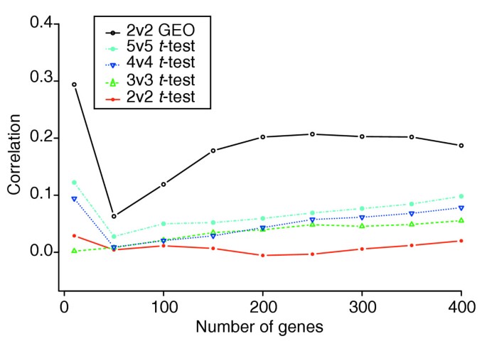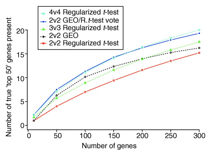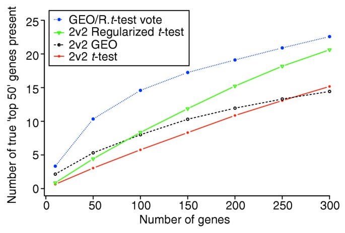 结果显示在2v2小样本实验中,GEO校正方法的基因排名与主列表的相关性显著高于标准t检验,返回的前50个差异基因中来自主列表前50的数量比标准t检验多231%(文献未明确样本量n,基于图表趋势推测),性能相当于5v5样本的标准t检验;混合投票方法的性能进一步提升,2v2样本下的结果相当于4v4样本的正则化t检验,返回的前50个差异基因中来自主列表前50的数量比正则化t检验多88%(文献未明确样本量n,基于图表趋势推测)。