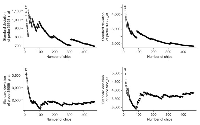实验目的是确定公共数据库中所需的最小芯片数量,以获得稳定的基因特异性方差估计。方法细节为按芯片数量递增的方式计算基因特异性方差,观察方差估计的收敛性,选择4个不同表达水平四分位数的基因进行分析。