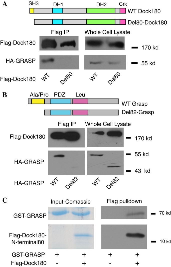 实验目的:确定GRASP与Dock180相互作用的具体结构域。方法细节:构建Dock180的N端截短突变体(缺失前80个氨基酸,即SH3结构域),与HA标记的野生型GRASP共转染HEK293细胞;同时构建GRASP的N端截短突变体(缺失前82个氨基酸,即脯氨酸富集区,Del82-GRASP),与Flag标记的Dock180共转染,通过免疫共沉淀检测相互作用;此外,通过原核表达GST融合的GRASP和Flag融合的Dock180 N端80aa,进行体外结合实验验证直接互作。结果解读:免疫共沉淀显示,缺失SH3结构域的Dock180无法与GRASP结合,缺失脯氨酸富集区的Del82-GRASP也无法与Dock180结合;体外结合实验进一步验证,GST-GRASP可直接结合Flag-Dock180 N端80aa,证明两者通过Dock180的SH3结构域与GRASP的脯氨酸富集结构域直接相互作用。产品关联:实验所用关键产品:GST融合蛋白表达系统、Glutathione-Sepharose beads、抗HA抗体、抗Dock180抗体。