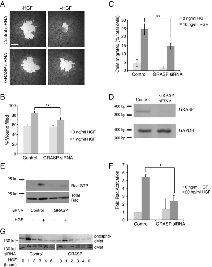 实验目的:验证GRASP在HGF诱导的Rac激活和上皮细胞迁移中的功能。方法细节:采用siRNA靶向敲低MDCK细胞中GRASP的表达,通过RT-PCR验证敲低效率;然后通过伤口愈合实验和Transwell迁移实验检测1ng/ml HGF诱导的迁移能力;同时用20ng/ml HGF处理细胞5小时后,通过GST-PBD pulldown检测Rac激活水平;并用免疫印迹检测不同时间点c-Met的磷酸化水平,排除上游受体激活异常。结果解读:RT-PCR显示GRASP mRNA表达水平较对照组降低约70%;伤口愈合实验显示,GRASP敲低组HGF诱导的伤口愈合率为42%±5%,对照组为63%±4%(n≥15,P<0.01);Transwell实验显示,敲低组迁移细胞数为对照组的62%±6%(n≥15,P<0.01),基础迁移能力在两组间无显著差异;GST-PBD pulldown显示,敲低组HGF诱导的Rac激活水平为对照组的58%±7%(n=4,P<0.05);免疫印迹显示,c-Met的磷酸化水平在敲低组和对照组中无显著差异,排除上游受体激活异常。产品关联:实验所用关键产品:GRASP靶向siRNA、Transwell小室、抗磷酸化c-Met抗体、抗总c-Met抗体、GST-PBD探针。