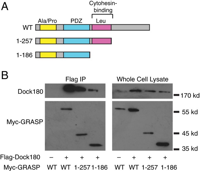 实验目的:验证GRASP是否能不依赖cytohesin 2而直接结合Dock180。方法细节:构建GRASP的系列截短突变体,包括缺失cytohesin结合结构域(亮氨酸富集区)的突变体,与Flag标记的Dock180共转染人胚肾293(HEK293)细胞,通过M2-Flag树脂进行免疫共沉淀实验,并用免疫印迹检测GRASP与Dock180的结合情况;同时以野生型GRASP与Dock180共转染作为阳性对照。结果解读:免疫共沉淀结果显示,即使GRASP缺失cytohesin结合结构域,仍能与Dock180共沉淀,证明GRASP与Dock180的相互作用独立于其与cytohesin 2的结合,提示GRASP可同时结合两种GEF分子。产品关联:实验所用关键产品:M2-Flag树脂、抗myc抗体(检测GRASP突变体)、抗Dock180抗体、HEK293细胞系。