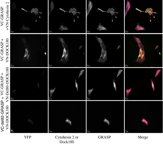 实验目的:在活细胞内验证GRASP与Dock180的相互作用。方法细节:采用双分子荧光互补(BiFC)实验,构建Venus荧光蛋白N端片段融合的Dock180(VN-Dock180)和C端片段融合的GRASP(VC-GRASP)表达载体,共转染MDCK细胞;同时以VN-cytohesin 2和VC-GRASP作为阳性对照,转染后固定细胞,通过免疫荧光标记Dock180和GRASP,并用荧光显微镜观察YFP荧光信号。结果解读:共转染VN-Dock180和VC-GRASP的细胞中检测到明显的YFP荧光信号,且荧光信号与Dock180、GRASP的免疫荧光信号共定位;而共转染缺失SH3结构域的VN-Del80-Dock180与VC-GRASP,或VN-Dock180与缺失脯氨酸富集区的VC-Del82-GRASP的细胞中,未检测到YFP荧光信号,进一步验证活细胞内GRASP与Dock180的结构域特异性相互作用。产品关联:实验所用关键产品:BiFC载体系统、Dylight系列荧光二抗、Olympus IX81荧光显微镜。