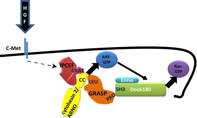 现有研究关键结论:HGF通过激活c-Met受体,启动下游Arf6和Rac1的级联激活;cytohesin 2作为Arf6的GEF,可通过与Dock180的相互作用间接激活Rac1;支架蛋白CNK3/IPCEF负责将cytohesin 2招募到细胞膜,但其无法直接桥接cytohesin 2与Dock180。技术方法优势:前期研究采用GST-PBD pulldown检测Rac激活、免疫共沉淀验证蛋白相互作用,具有较高的特异性和可靠性;局限性:缺乏对GRASP与Dock180直接相互作用的结构域解析,以及GRASP在活细胞内功能的直接验证,无法完整阐明Arf-Rac信号串话的支架蛋白调控机制。