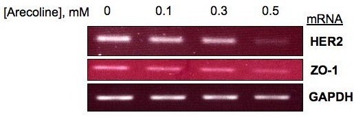 结果解读:逆转录PCR结果显示,槟榔碱以剂量依赖方式下调HER2和ZO-1的转录水平,0.3mM处理时已出现显著下调,0.5mM处理时效应最显著(文献未明确提供样本量及P值,基于图表趋势推测);GAPDH转录水平无显著变化,作为内参验证RNA提取和逆转录的一致性,说明槟榔碱通过转录下调介导ZO-1和HER2的蛋白表达降低。