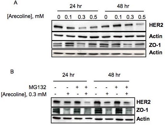 结果解读:蛋白免疫印迹(WB)结果显示,0.3mM槟榔碱处理24h即可显著下调ZO-1和HER2的蛋白表达,且该浓度下未诱导细胞凋亡,0.5mM浓度下效应进一步增强但可能引发细胞毒性(文献未明确提供样本量及P值,基于图表趋势推测);肌动蛋白表达无显著变化,作为内参验证蛋白上样量一致。