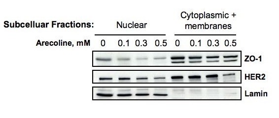 方法细节:用0.1mM、0.3mM、0.5mM槟榔碱处理细胞24h和48h,采用间接免疫荧光(免疫荧光)染色观察ZO-1的定位,同时采用NE-PER核质分离试剂分离细胞核和胞质/膜组分,通过蛋白免疫印迹检测不同组分中ZO-1和HER2的表达,以核纤层蛋白为细胞核组分内参。