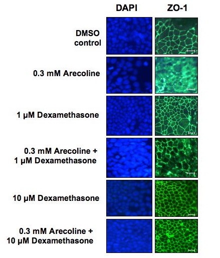 方法细节:用1μM和10μM地塞米松处理Ishikawa细胞,同时加入0.3mM槟榔碱,培养后采用间接免疫荧光染色观察ZO-1的定位。
