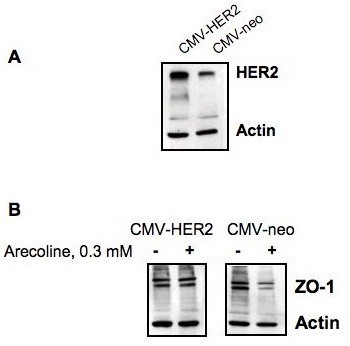 实验所用关键产品:Dulbecco"s改良Eagle培养基、胎牛血清购自Biowhittaker;槟榔碱氢溴酸盐购自Aldrich;ZO-1、HER2抗体购自Invitrogen和Santa Cruz Biotechnology;蛋白免疫印迹检测试剂购自GE healthcare。