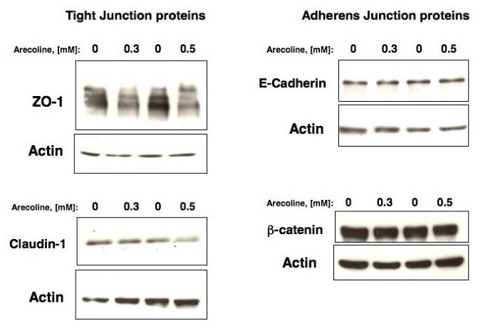 方法细节:用0.3mM和0.5mM槟榔碱处理细胞48h,提取总蛋白进行蛋白免疫印迹检测,检测指标包括紧密连接蛋白ZO-1、Claudin-1,黏着连接蛋白E-钙黏蛋白、β-连环蛋白,以肌动蛋白为内参。