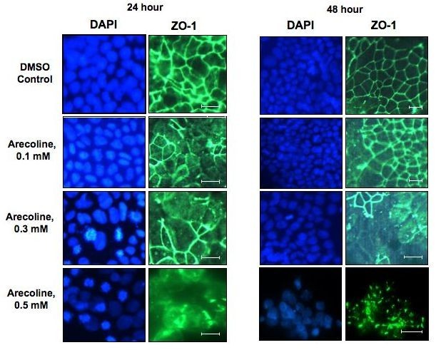 实验目的:明确槟榔碱对ZO-1亚细胞定位的影响,揭示其对紧密连接结构的破坏作用。
