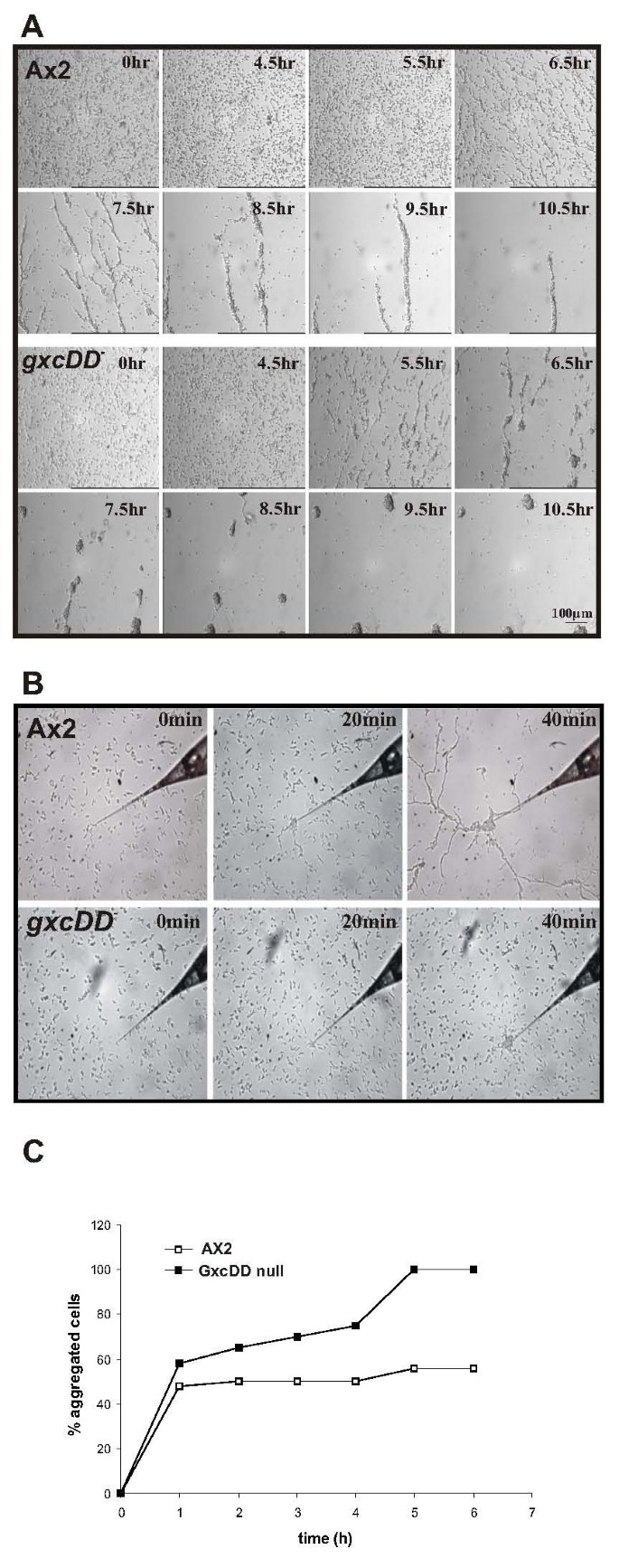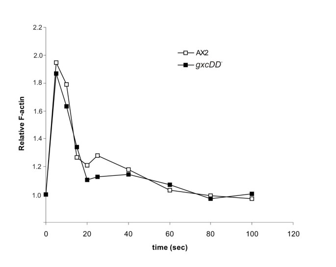 结果解读:gxcDD敲除株的生长、吞噬、胞质分裂无显著异常,但发育过程延迟超过4小时(n=2,文献未明确提供P值),野生型AX2细胞在20-24小时完成发育形成子实体,而敲除株需28小时(图6、图7);发育聚集流形成缺陷,敲除株无法形成稳定的长流,流易断裂为聚集物(图8);cAMP诱导的肌动蛋白聚合水平与野生型无显著差异(图9),提示GxcDD主要调控发育时序与聚集流形成,而非基础的细胞运动与肌动蛋白重排。