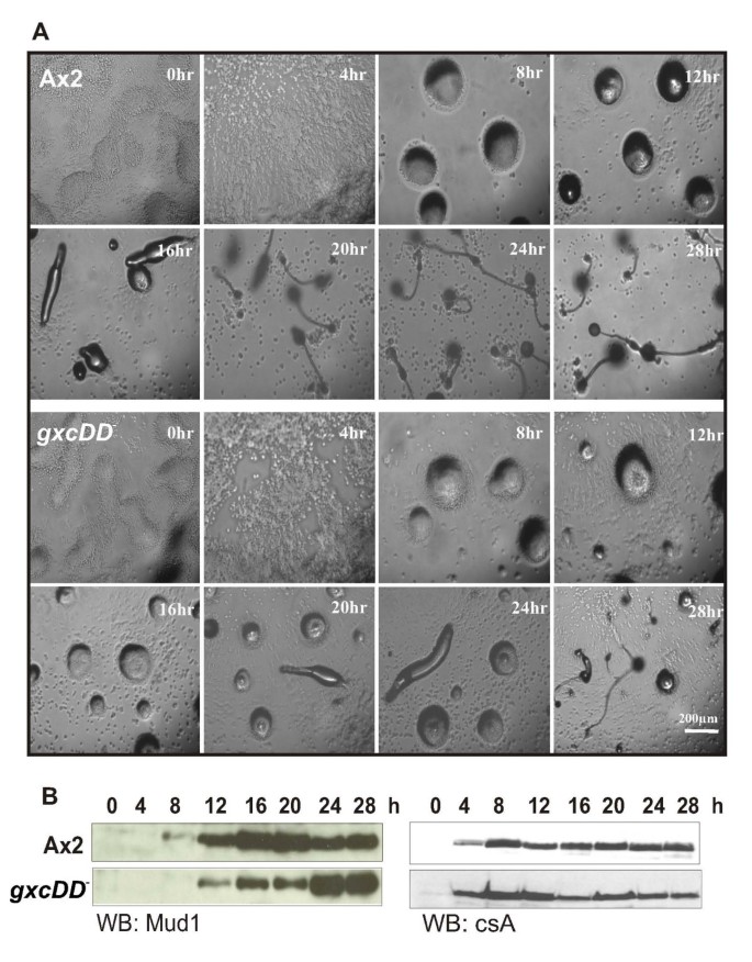 方法细节:通过同源重组构建gxcDD基因敲除株;分析敲除株的生长、吞噬、胞质分裂等基础细胞功能;通过发育时序观察、Western印迹检测发育标记蛋白、毛细管趋化实验分析发育表型。