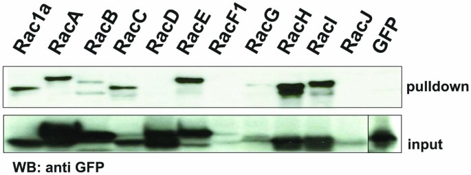 结果解读:GxcDD的Rho鸟苷酸交换因子结构域可与Rac1a、RacA、RacC、RacE、RacH、RacI发生物理相互作用,但不与RacB、RacD结合(图3),显示出与Rac家族成员的结合特异性,提示GxcDD可能作为这些Rac的上游调控因子。