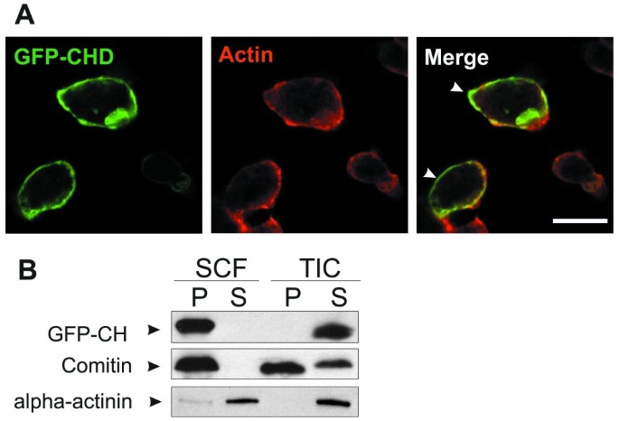 方法细节:构建绿色荧光蛋白-钙调蛋白结合蛋白同源结构域融合蛋白表达载体,转化盘基网柄菌AX2细胞;通过活细胞成像与免疫荧光染色分析绿色荧光蛋白-钙调蛋白结合蛋白同源结构域的亚细胞定位;采用亚细胞分离与Triton X-100处理分析其分布;以肌动蛋白结合蛋白comitin和α-辅肌动蛋白作为标记物。