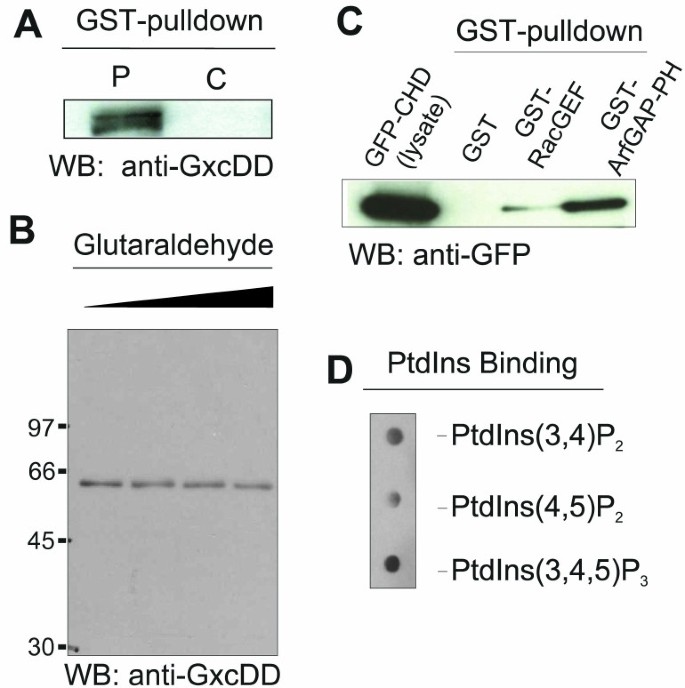 结果解读:绿色荧光蛋白-ADP核糖基化因子GTP酶激活蛋白-普列克底物同源性结构域定位于细胞皮层与吞噬体,并可与肌动蛋白共定位;谷胱甘肽S-转移酶下拉实验证实该结构域可与全长GxcDD相互作用,且该结构域可结合磷脂酰肌醇(3,4)二磷酸、磷脂酰肌醇(4,5)二磷酸,对磷脂酰肌醇(3,4,5)三磷酸的结合能力最强(图4、图5),提示该结构域可能通过结合磷脂参与膜定位与信号调控。