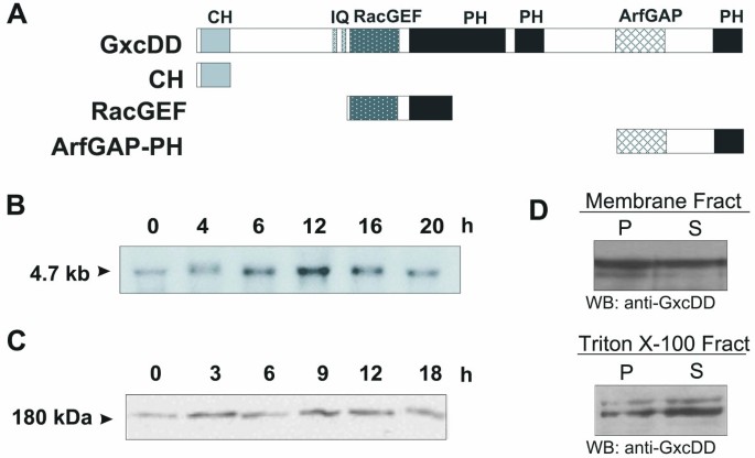 结果解读:GxcDD为180kDa多结构域蛋白,包含1个钙调蛋白结合蛋白同源结构域、2个IQ基序、3个普列克底物同源性结构域、1个Rho鸟苷酸交换因子结构域和1个ADP核糖基化因子GTP酶激活蛋白结构域(图1);GxcDD在盘基网柄菌整个发育过程中持续表达,蛋白水平无显著变化;亚细胞定位显示GxcDD同时存在于胞质与膜组分中,并与Triton X-100不溶性细胞骨架组分结合。