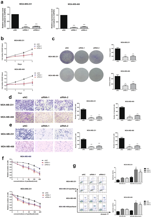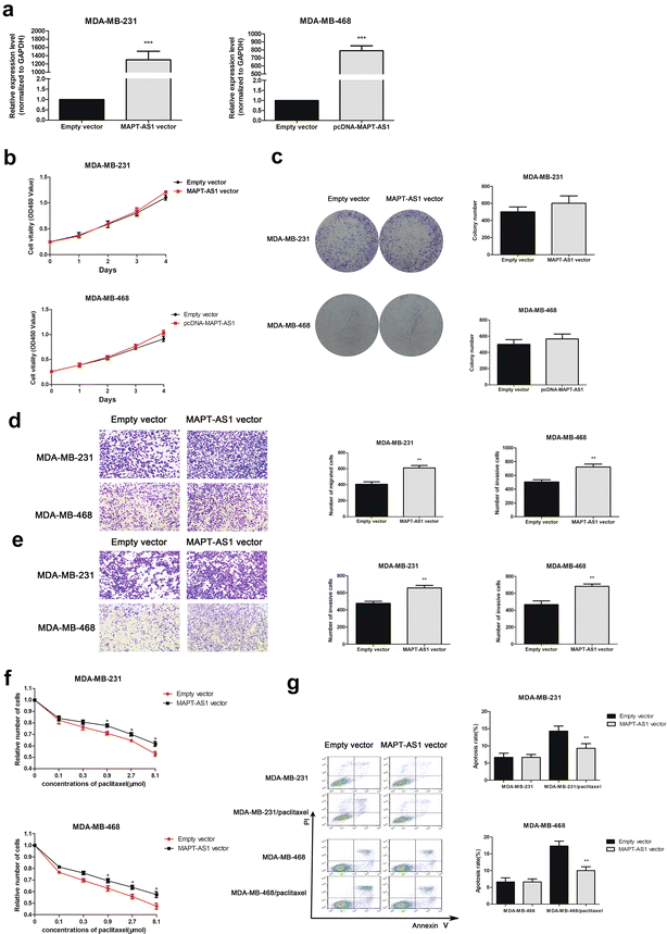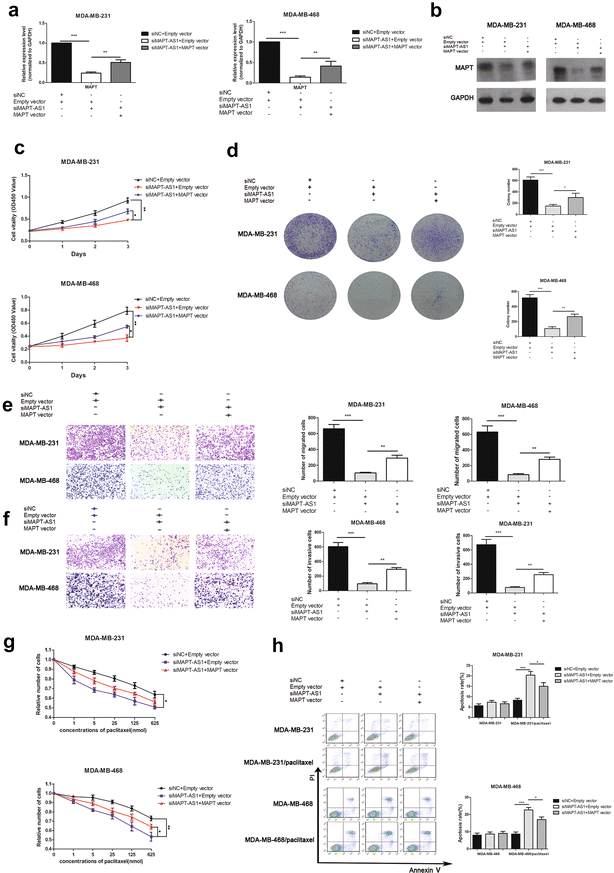方法细节:在MDA-MB-231和MDA-MB-468两种ER阴性乳腺癌细胞系中,采用GenePharma合成的靶向MAPT-AS1的siRNA敲低其表达,同时采用过表达质粒上调其表达;通过CCK-8实验、克隆形成实验检测细胞增殖能力,Transwell穿膜实验检测细胞迁移及侵袭能力。