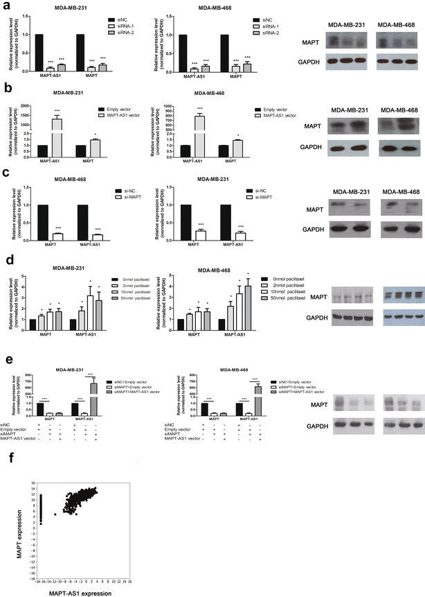 方法细节:采用实时荧光定量聚合酶链反应和蛋白质免疫印迹(Western Blot)检测敲低或过表达MAPT-AS1后MAPT的mRNA和蛋白表达水平;检测敲低MAPT后MAPT-AS1的表达水平;通过回复实验,在敲低MAPT-AS1的细胞中过表达MAPT,验证其对细胞增殖、迁移及紫杉醇敏感性的影响。
