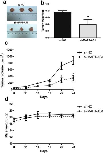 方法细节:将MDA-MB-231细胞接种于5周龄雌性裸鼠皮下,待肿瘤生长至可测量大小(接种后14天),将裸鼠随机分为两组,瘤内注射siRNA-Invivofectamine 2.0复合物以敲低MAPT-AS1表达,分别在接种后8、11、14、17、20、23天测量肿瘤体积,23天后处死裸鼠,称量肿瘤重量并记录小鼠体重变化。
