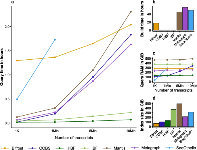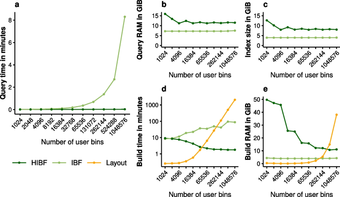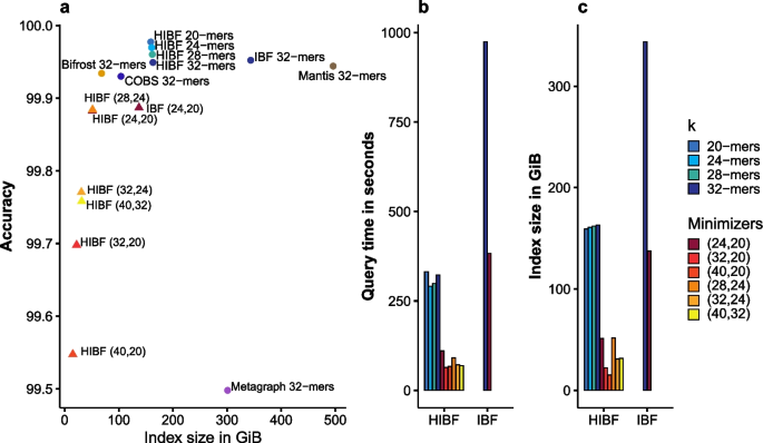 本文献为生物信息学工具开发类研究,未涉及传统意义上的疾病相关Biomarker,核心成果为提出的Hierarchical Interleaved Bloom Filter(HIBF)索引结构的关键性能参数(查询速度、内存占用、构建时间、索引大小)作为工具效能的“性能标志物”,通过多数据集验证了其在大规模序列查询中的优越性。
