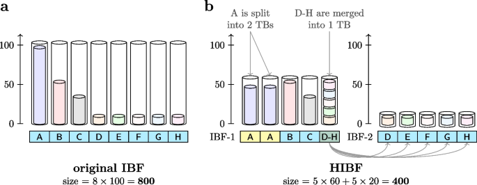 结果解读:如图2所示,在不平衡数据集上,IBF中小用户bin对应的技术bin存在大量空间浪费(外层圆柱与内层圆柱的差值);当bin数增加到百万级时,IBF的查询时间随bin数线性增长,而HIBF通过固定技术bin数量,查询速度几乎不受bin数影响;