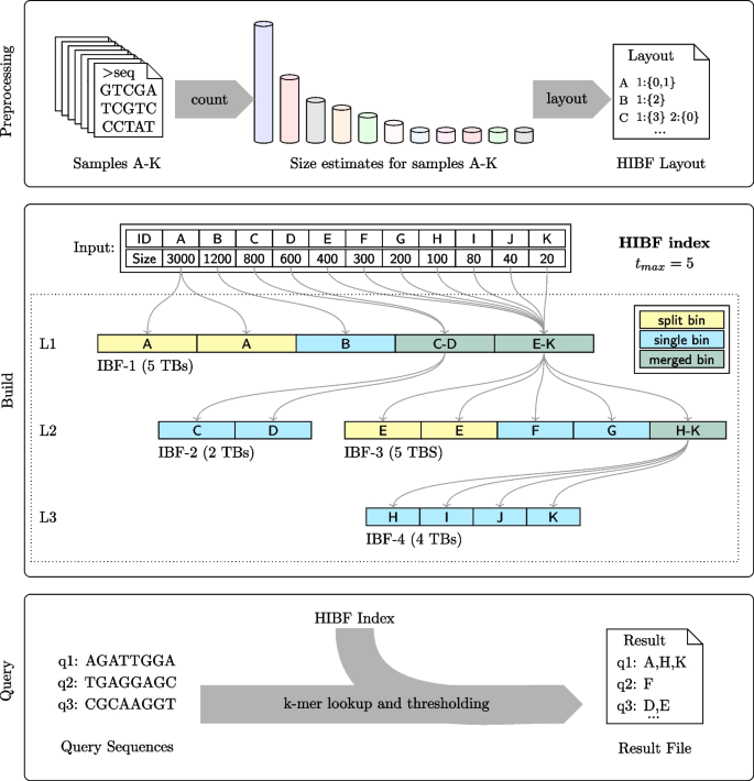 方法细节:区分用户bin(UB,具有语义的样本集合)与技术bin(TB,IBF中的存储单元),将大用户bin拆分为多个技术bin以降低单个TB的大小,将小用户bin合并为技术bin以减少空间浪费;对合并的技术bin递归构建下层IBF,实现精确查询;开发动态规划(DP)算法,结合HyperLogLog估计用户bin的k-mer集合大小,优化HIBF的整体空间占用;通过Jaccard距离对用户bin进行重排,提高合并bin的空间效率;
