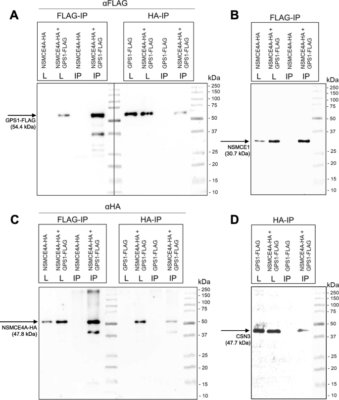 结果解读:抗FLAG抗体的免疫共沉淀能够检测到共表达的HA-NSMCE4A,抗HA抗体的免疫共沉淀也能检测到FLAG-GPS1,同时在FLAG免疫沉淀复合物中检测到SMC5/6的另一个亚基NSMCE1,在HA免疫沉淀复合物中检测到CSN的亚基CSN3,说明NSMCE4A与GPS1的相互作用并非孤立存在,而是发生在完整的SMC5/6和CSN复合物之间。