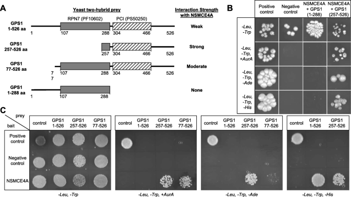 结果解读:初始筛选得到121个阳性克隆,经过验证后得到28个阳性克隆对应16个基因,其中GPS1被多个不同长度的cDNA片段所编码,进一步的片段分析显示,GPS1的C端PCI结构域(257-526氨基酸)是与NSMCE4A相互作用的关键区域,而N端区域(1-288氨基酸)无相互作用,且全长GPS1的相互作用强度弱于缺失N端77个氨基酸的片段,提示N端可能对相互作用存在负调控作用。