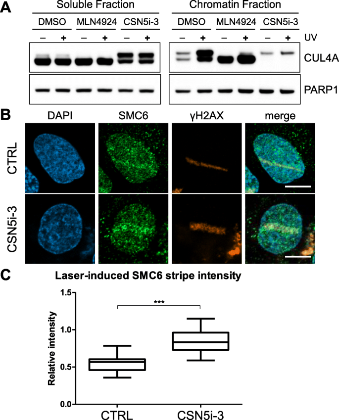 结果解读:CSN5i-3处理后,CUL4A的NEDD化水平显著升高,说明CSN的去NEDD化功能被有效抑制;同时,SMC6在激光诱导DNA损伤位点的信号强度显著高于对照组(n=未明确提供,P<0.0001),提示CSN的去NEDD化功能参与调控SMC5/6在DNA损伤位点的定位。