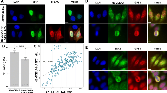 方法细节:在HeLa细胞中单独或共表达HA-NSMCE4A和FLAG-GPS1,用免疫荧光染色标记两种蛋白,通过激光共聚焦显微镜观察细胞内定位,利用图像分析软件定量分析NSMCE4A的核质比,并分析其与GPS1核质比的相关性。