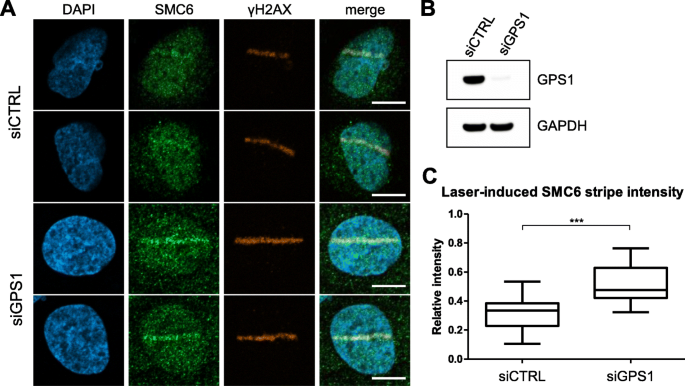 方法细节:在U-2 OS细胞中用siRNA敲低GPS1的表达,48小时后用405nm激光诱导DNA损伤条纹,免疫荧光染色标记SMC6,通过图像分析定量损伤位点的SMC6信号强度与细胞核背景信号强度的比值。