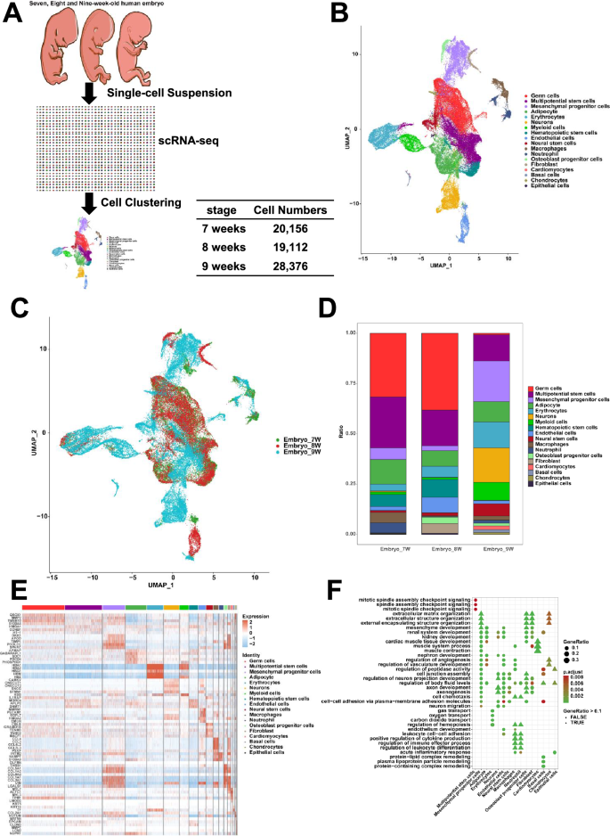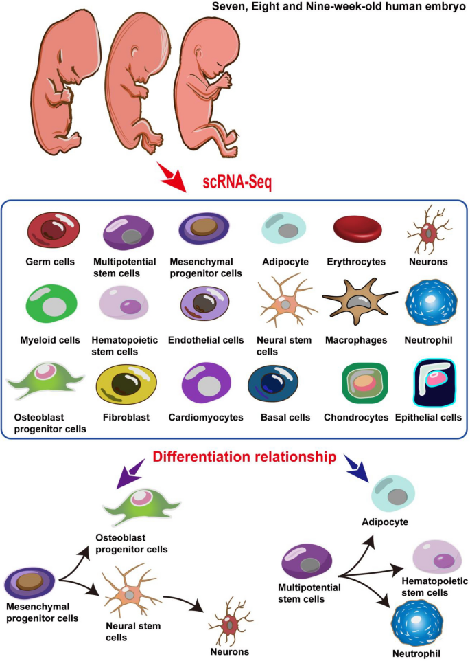 针对这一研究空白,本研究采用单细胞RNA测序技术,对7、8、9周人类胚胎进行分析,旨在构建该过渡阶段的细胞发育图谱,明确细胞类型及分化关系,为人类胚胎发育机制研究提供关键数据支撑。