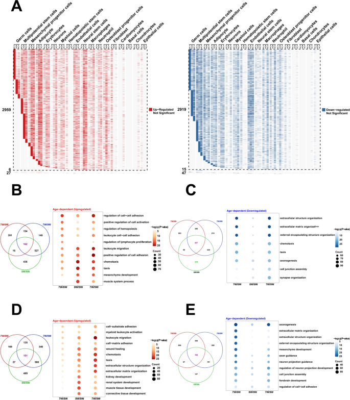 实验目的是鉴定各细胞簇的类型,并分析胚胎发育过程中的基因表达动态变化。方法细节为参考CellMarker、PanglaoDB数据库及已发表文献中的细胞标记基因,对18个细胞簇进行类型注释;采用FindAllMarkers函数筛选差异表达基因(DEGs),将样本分为三组(8周vs7周、9周vs8周、9周vs7周)分析不同发育阶段的基因表达变化,使用clusterProfiler包进行GO富集分析,明确差异基因参与的生物学过程。结果解读为成功注释得到18种细胞类型,包括生殖细胞、多能干细胞、间充质祖细胞、成骨细胞祖细胞、神经干细胞、神经元等;差异表达基因分析显示,多能干细胞的DEGs参与造血调控、间充质发育等生物学过程,间充质祖细胞的DEGs参与趋化、肾脏发育等过程,提示这两类细胞具有多向分化潜能(GO富集P_adj<0.05)。实验所用关键产品:CellMarker数据库、PanglaoDB数据库、clusterProfiler R包。