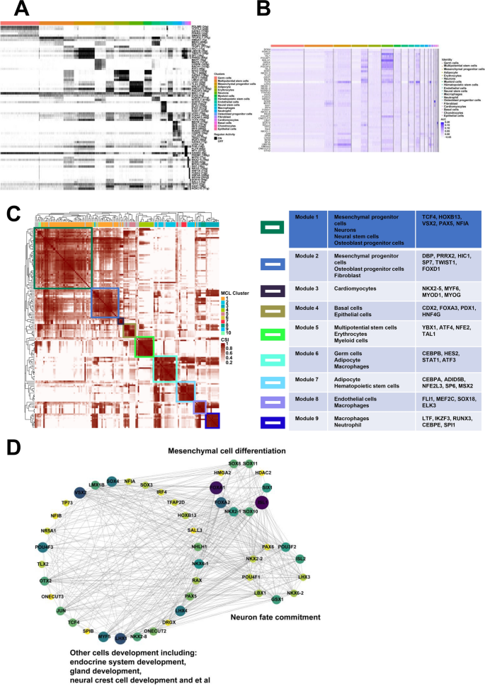 实验目的是解析细胞分化的转录调控机制,鉴定关键调控因子。方法细节为采用pySCENIC包分析转录因子调控网络,将Seurat对象转换为Loom格式,通过共表达基因推断基因调控网络,结合已知转录因子结合位点筛选候选靶基因,计算AUC值并进行二值化处理,采用Cytoscape软件可视化调控网络。结果解读为不同细胞簇激活了特异性转录因子,如间充质祖细胞中的HIC1、LMX1B、TWIST1,神经干细胞中的LHX3、EVX2,神经元中的LHX1、TLX2;共调控因子如HOXB13、VSX2、PAX5介导细胞发育与分化;模块分析显示,152个调控子聚类为9个模块,不同细胞簇共享调控模块,如模块1包含间充质祖细胞、神经元、神经干细胞和成骨细胞祖细胞,参与神经系统发育和间充质细胞分化;调控网络分析显示,SOX8、SOX11等参与间充质细胞分化,PAX6、POU3F2等参与神经元命运决定。实验所用关键产品:pySCENIC包、Cytoscape软件。