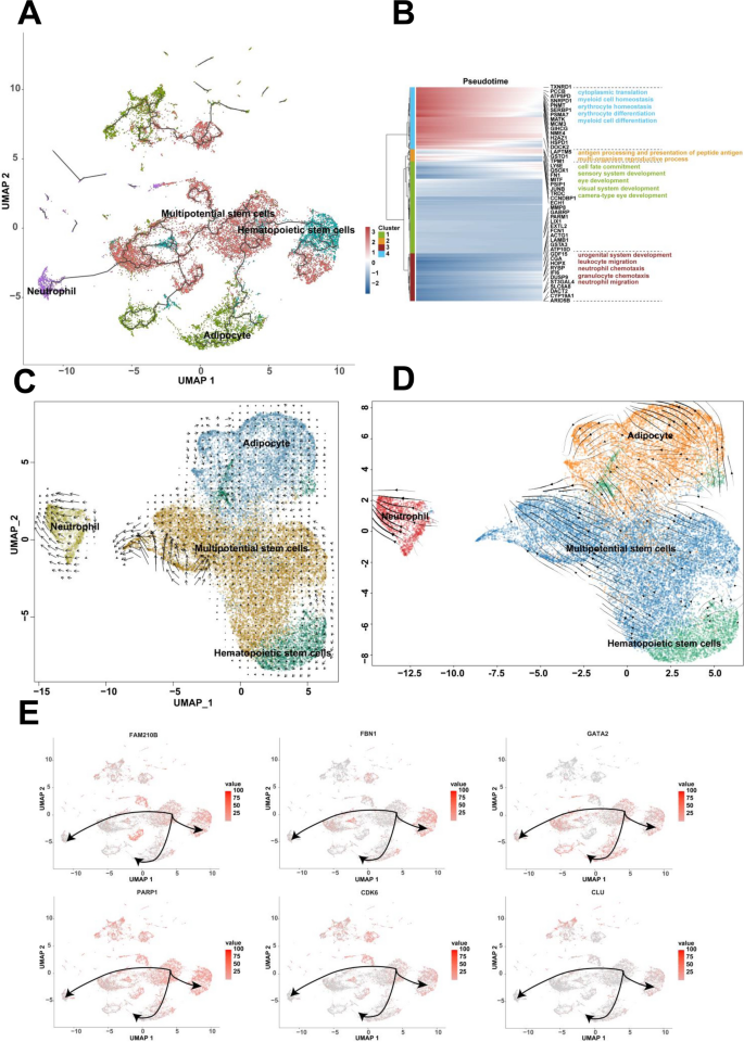实验目的是解析人类7-9周胚胎细胞的分化路径及方向。方法细节为采用Monocle3软件构建细胞分化轨迹,筛选在至少1%细胞中表达且经验离散值大于拟合离散值的基因进行拟时间分析,通过DDRTree方法降维并重建分化轨迹;同时采用RNA velocity(scVelo)分析细胞的分化方向与状态。结果解读为揭示了两条独立的细胞分化路径:第一条路径中间充质祖细胞作为分化起点,分别分化为成骨细胞祖细胞和神经干细胞,神经干细胞进一步分化为神经元;第二条路径中多能干细胞作为起点,分别分化为脂肪细胞、造血干细胞和中性粒细胞;RNA velocity分析显示,间充质祖细胞和神经干细胞具有高度异质性,可向多个方向分化,而成骨细胞祖细胞和神经元处于稳定的分化终末状态。实验所用关键产品:Monocle3 R包、scVelo软件。