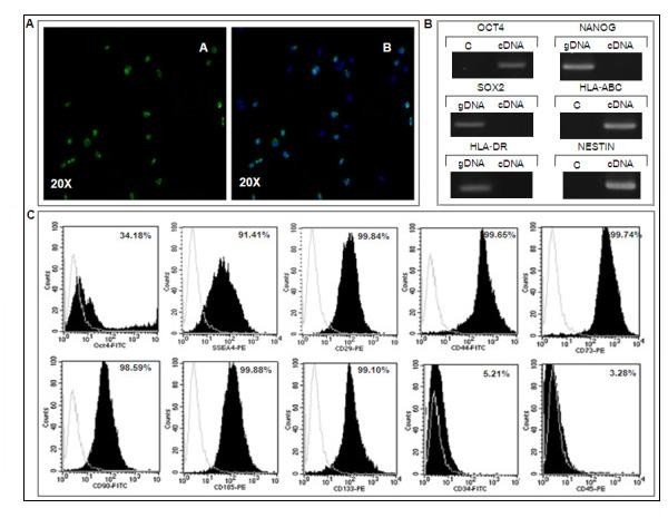 );RT-PCR结果显示,细胞表达Oct4a与HLA-ABC,但不表达Nanog、Sox2与HLA-DR;流式细胞术结果显示,99-100%的细胞表达间充质干细胞标志物CD29、CD44、CD73、CD105,CD133呈高表达,CD90呈低表达,造血干细胞标志物CD34、CD45呈阴性表达;24-41%的细胞表达Oct4a,48-91%的细胞表达SSEA4,证明细胞群体具有高度均一性与干细胞特性。