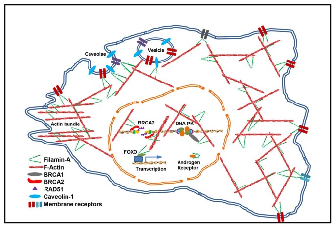 实验目的是总结Filamin-A在细胞信号通路调控与DNA损伤修复中的功能,明确其与癌症进展及治疗反应的关联。方法为整合Filamin-A参与信号转导及DNA修复的相关研究成果,系统分析其分子机制与临床意义。结果解读:Filamin-A可作为支架蛋白参与多种细胞信号通路调控,如与R-RAS结合维持内皮屏障功能,与雄激素受体结合调控细胞迁移信号,其功能异常可影响肿瘤细胞的增殖与存活;同时,Filamin-A可与BRCA1、BRCA2等DNA修复蛋白结合,参与同源重组修复过程,抑制Filamin-A表达可增强肿瘤细胞对电离辐射、顺铂等DNA损伤类治疗药物的敏感性,但会提高细胞对拓扑异构酶抑制剂的耐药性,提示其在不同DNA损伤类型中的功能存在异质性。