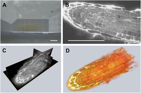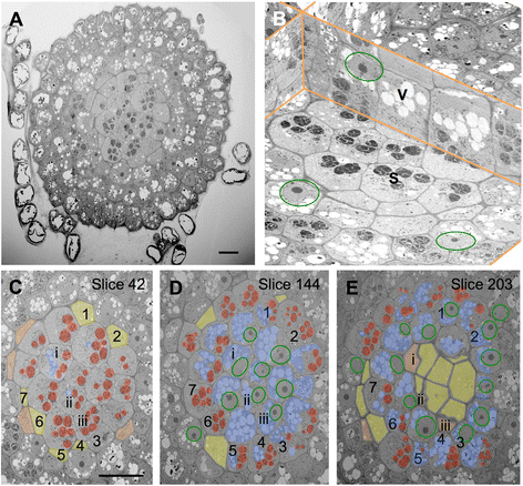 方法细节:将拟南芥根样本包埋在Lowicryl HM20亲水性树脂中,制备100nm厚度的连续切片阵列,使用1μg/mL碘化丙啶对切片进行染色,在ZEISS Cell Observer宽场荧光显微镜下采集图像,通过TrakEM2软件对200片切片的图像进行对齐与三维重建。