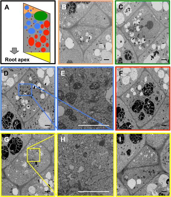 针对斑马鱼免疫细胞群体,通过层级成像的60nm分辨率成像统计239个细胞(n=239)的类型比例,结合5nm分辨率成像的细胞器分析,定义了不同免疫细胞类型的结构特征,如细胞毒性细胞的核质比高、细胞质中存在大量分泌溶酶体,粒细胞则具有特征性的颗粒结构;针对水芹根冠组织,通过60nm分辨率成像的全景分析确定细胞的极性分布模式,再通过5nm分辨率成像的单个细胞分析,明确了细胞器的极性分布细节,如顶端区域仅存在膜系统,线粒体等细胞器集中在细胞中下部。