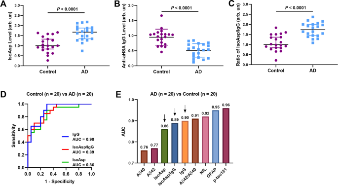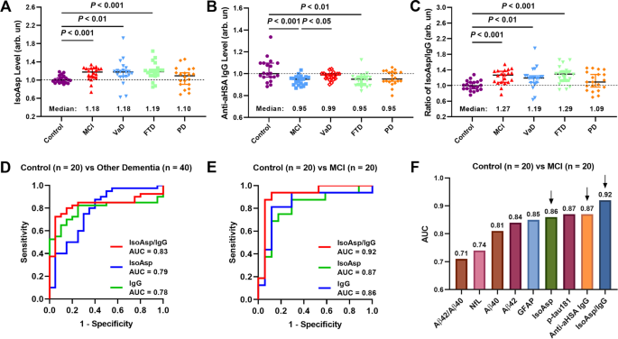 该类Biomarker来源于受试者外周静脉血浆样本,isoAsp水平通过间接ELISA检测并以健康对照平均值归一化,抗脱酰胺化HSA IgG水平通过纯化IgG后采用ELISA检测并归一化;验证方法包括组间差异比较、ROC曲线分析、Pearson相关性分析等多种统计学方法。特异性与敏感性数据显示,在区分MCI与健康对照时,IsoAsp/IgG比值的AUC为0.92(95%CI未明确提供),诊断准确性达92%;区分AD与健康对照时,isoAsp水平的AUC为0.80以上,抗脱酰胺化HSA IgG的AUC也在0.80以上;区分VaD、FTD与健康对照时,脱酰胺化生物标志物的AUC为0.78-0.83,表现出较好的诊断特异性与敏感性。