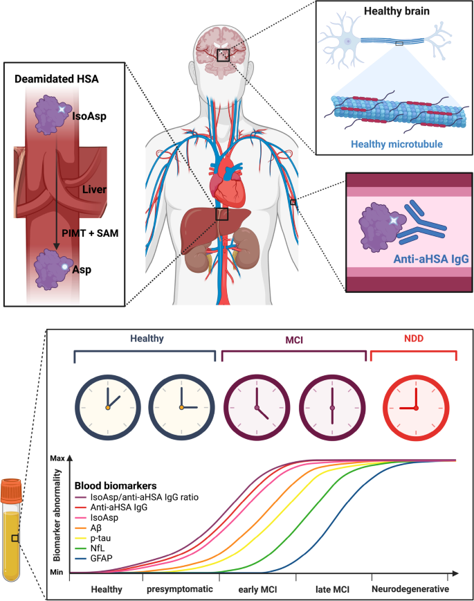 现有研究中,脑脊液标志物如Aβ、tau蛋白等虽具有较高的诊断准确性,但采样过程侵入性强、检测成本高,难以实现大规模早期筛查;血液标志物如NfL、GFAP、p-tau181等近年发展迅速,在AD临床确诊期的诊断中表现较好,但对MCI等早期阶段的区分能力有限,且多数研究集中于高加索人群,在亚洲等非高加索人群中的验证数据严重不足。此外,前期仅在阿姆斯特丹高加索队列中发现血清白蛋白(HSA)的isoAsp水平升高、抗脱酰胺化HSA的IgG水平降低与AD相关,但该研究未涉及其他NDDs类型及MCI早期阶段,也未在亚洲人群中验证脱酰胺化生物标志物的通用性。