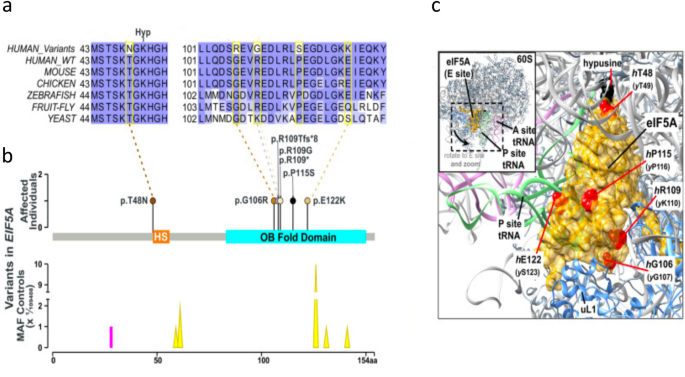 - 孟德尔遗传病致病Biomarker:来源为发育迟缓、小头畸形患者的临床样本,验证方法为全外显子测序、酵母功能互补实验,数据显示患者携带eIF5A1杂合错义突变,突变位于蛋白表面高度保守区域,可降低eIF5A1与核糖体的相互作用,抑制多脯氨酸基序蛋白的翻译;在表达突变体的酵母中补充亚精胺可部分恢复eIF5A1功能。