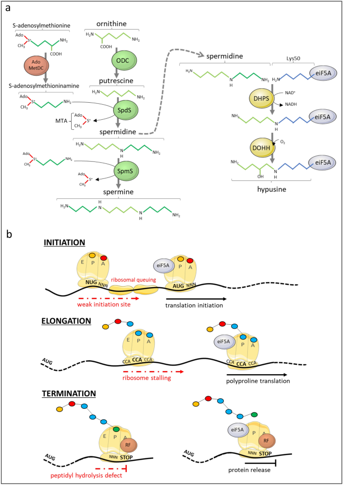 结果解读:eIF5A1基因定位于人类17p12-p13,存在两种蛋白亚型(亚型A含线粒体定位序列,亚型B为主要表达形式);蛋白结构分为N端(含羟腐胺修饰位点Lys50)和C端结构域;羟腐胺修饰由脱氧羟腐胺合酶(DHPS)和脱氧羟腐胺羟化酶(DOHH)两步催化完成,依赖多胺通路的亚精胺供给。