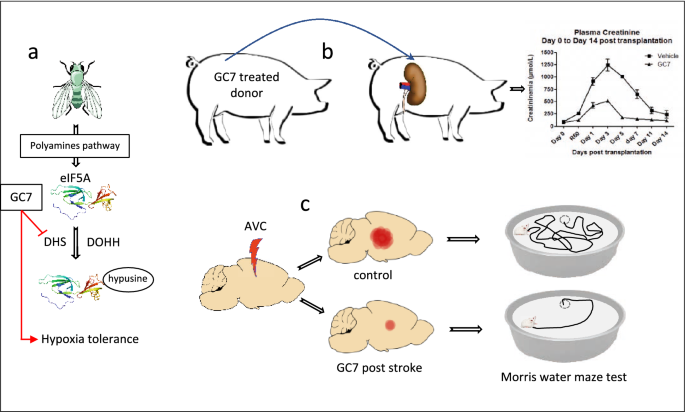 结果解读:在糖尿病中,eIF5A1通过调控胰岛β细胞NOS2翻译参与炎症损伤,抑制剂GC7可保护β细胞功能;在神经老化中,eIF5A1羟腐胺修饰水平下降与线粒体功能障碍相关,补充亚精胺可恢复其修饰水平并改善认知功能;在缺血性损伤中,抑制eIF5A1修饰可通过代谢重编程诱导细胞缺氧耐受,减轻肾、脑缺血损伤;在孟德尔遗传病中,eIF5A1杂合突变可导致发育迟缓、小头畸形等,突变影响其与核糖体的相互作用。