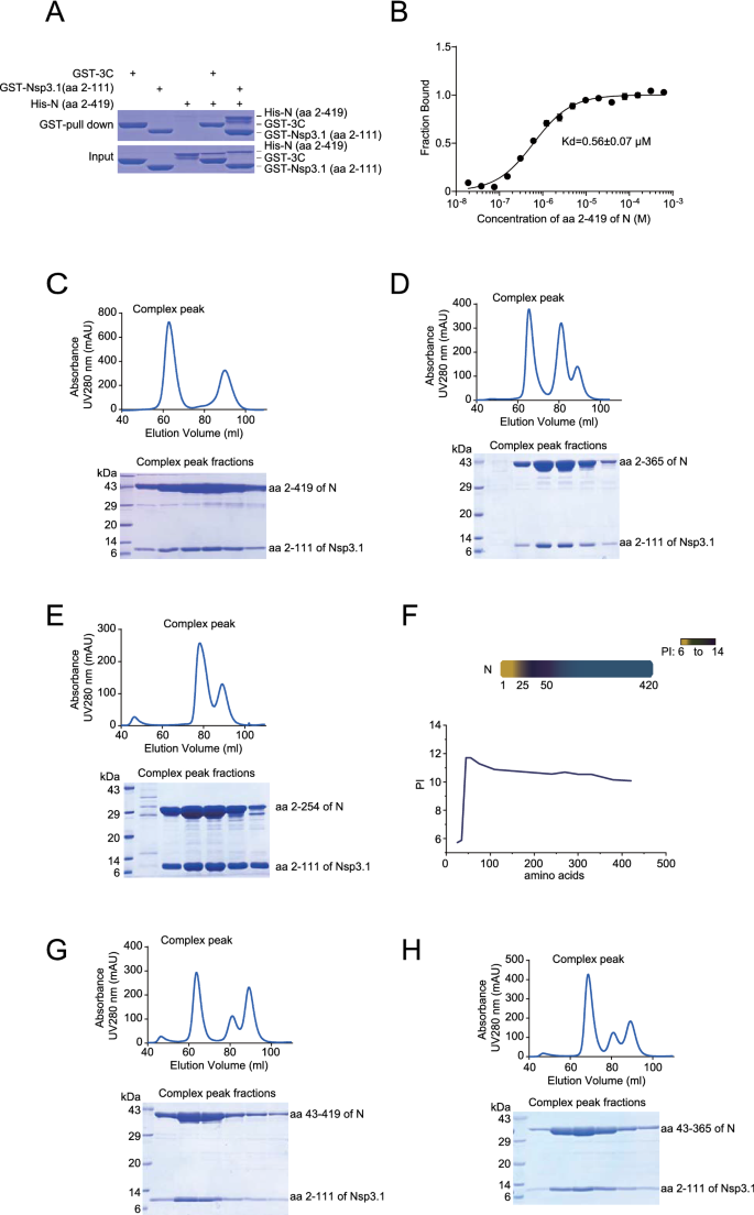实验目的是在体外蛋白水平验证N与Nsp3.1的直接相互作用,并测定两者的结合亲和力。方法细节为:在大肠杆菌BL21(DE3)中表达GST标签的Nsp3.1截短体(aa2-111)和His标签的N蛋白截短体(aa2-419),通过GST-pull down实验检测直接相互作用;采用微量热泳动(MST)技术测定两者的解离常数(Kd);通过凝胶过滤层析分析两者形成的复合物。结果解读:GST-pull down实验证实Nsp3.1与N蛋白在体外可直接结合;MST检测显示两者的解离常数为0.56±0.07 μM(n=3),表明具有中等强度的结合亲和力;凝胶过滤层析结果显示,两者共表达后可形成稳定的蛋白复合物,且N蛋白的CTD缺失不影响复合物形成。产品关联:文献未提及具体实验产品,领域常规使用原核表达载体、GST亲和树脂、MST检测系统、凝胶过滤层析柱等。