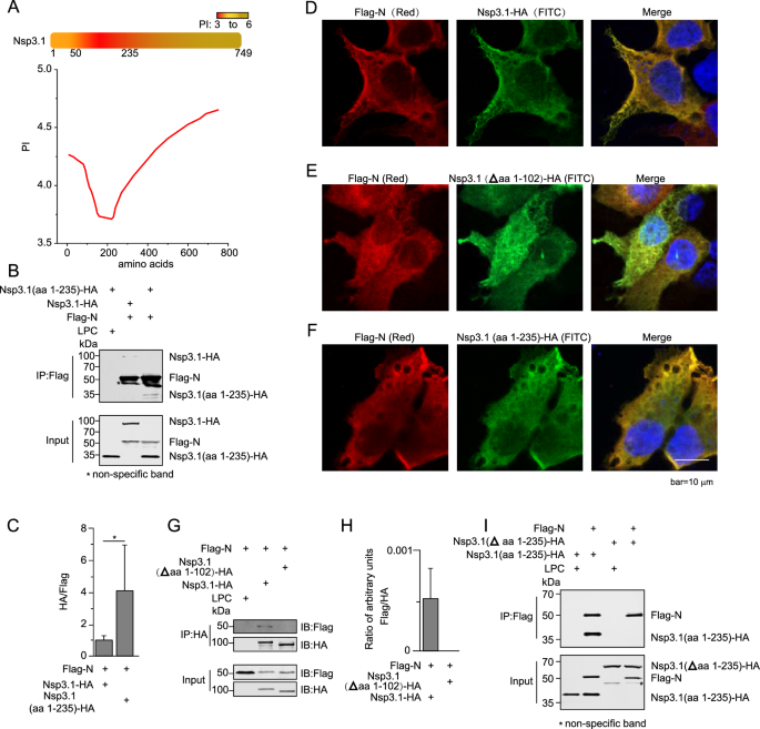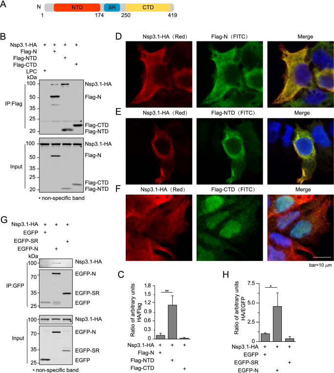 实验目的是确定N蛋白与Nsp3.1相互作用的关键结构域,明确两者结合的分子基础。方法细节为:构建N蛋白的截短体(N端结构域NTD、C端结构域CTD、丝氨酸-精氨酸富集结构域SR)和Nsp3.1的截短体(aa1-235、Δaa1-102、Δaa1-235),在HEK293T细胞中分别与对应蛋白共表达,通过Co-IP检测相互作用能力,通过免疫荧光染色观察蛋白共定位情况;对于难以表达的SR结构域,采用EGFP融合标签增强表达后进行检测。结果解读:N蛋白仅通过NTD结构域与Nsp3.1相互作用,CTD和SR结构域无相互作用能力,且NTD与Nsp3.1的相互作用强度显著高于全长N蛋白,提示N蛋白的其他结构域可能对该相互作用存在负调控;Nsp3.1通过N端aa1-102的酸性区域与N蛋白结合,删除该区域后,两者的相互作用显著减弱,共定位消失;EGFP融合的SR结构域无法与Nsp3.1相互作用,进一步证实SR不参与该结合过程。产品关联:文献未提及具体实验产品,领域常规使用免疫荧光染色试剂盒、激光共聚焦显微镜、蛋白融合标签载体等。
